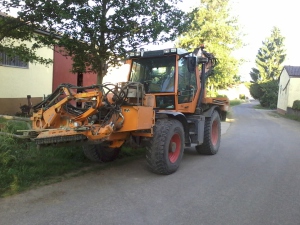 Fendt Xylon mit einem Mulag Randstreifenmäher in der Front und im Heck einen Mulag Auslegemäher